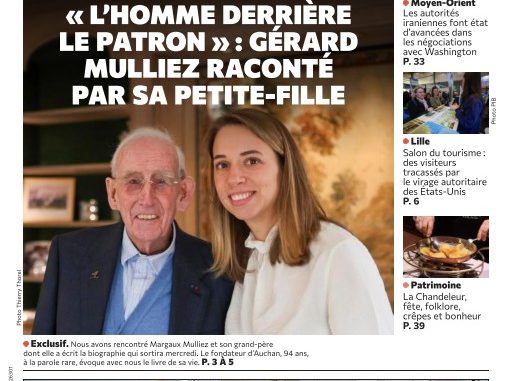 Le plan com’ de la dernière Mulliez quadrille la France : après l’ouest, voici La Voix du Nord. Le journal n’a pas lésiné sur les formats et c’est la cheffe du service économie, Valérie Sauvage, qui s’y colle : recension de l’ouvrage, grand entretien en binôme avec Margaux Mulliez et son « Daddy » Gérard, et même un podcast : « Les coulisses de notre rencontre exclusive avec Gérard Mulliez, fondateur d’Auchan » (5/02). On trouve dans la recension de La Voix du Nord d’autres informations de la plus haute importance, comme celle-ci : « Pour préparer son livre, Margaux Mulliez a lu des biographies, comme celle de Steve Jobs. » C’est bon à savoir. « Ni révélations indiscrètes, ni voix dissonantes », remarque quand même Valérie Sauvage : « L’histoire d’un homme qui a bâti un empire commercial. Un grand-père. Un homme d’affaires. » Un héros ?