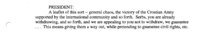 Pour les Serbes désormais pris au piège dans une enclave ethnique hostile, Tudjman a suggéré une campagne de propagande massive ciblant les Serbes, avec des tracts proclamant « la victoire de l’armée croate soutenue par la communauté internationale » et appelant les Serbes à ne pas fuir – dans une tentative apparente de donner un vernis inclusif à leur proposition de déplacement forcé de la population civile. « Cela signifie leur offrir une issue, tout en prétendant [souligné par nous] garantir les droits civils… Utiliser la radio et la télévision, mais aussi des tracts. »